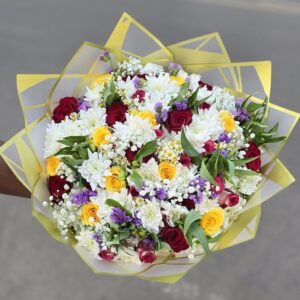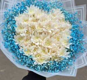 WHITE CHRYSANTHEMUMS WITH COLORED BABY BREATH