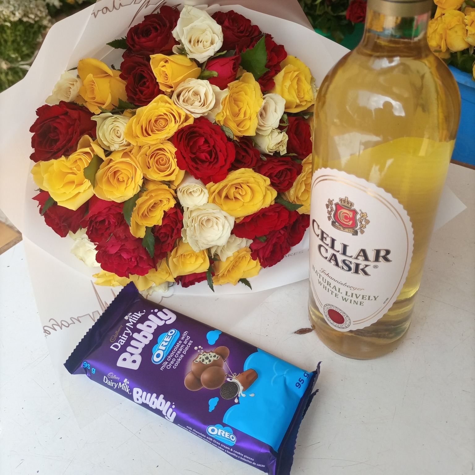 Assorted Handheld Bouquet with Cadbury chocolate and Cellar cask wine.