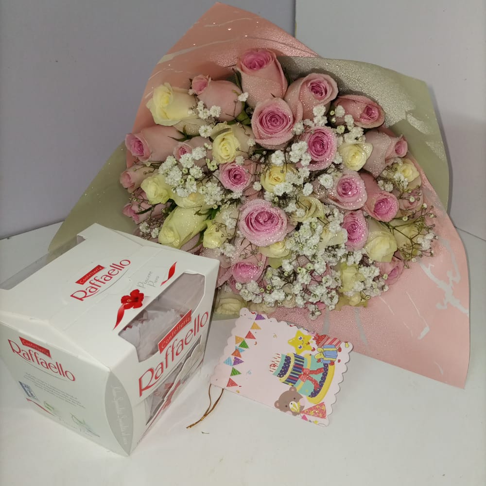 Flower package with Raffaello chocolate suitable for Mother’s day, Valentines, love and romance, Get well soon, New born baby, Am sorry among others.