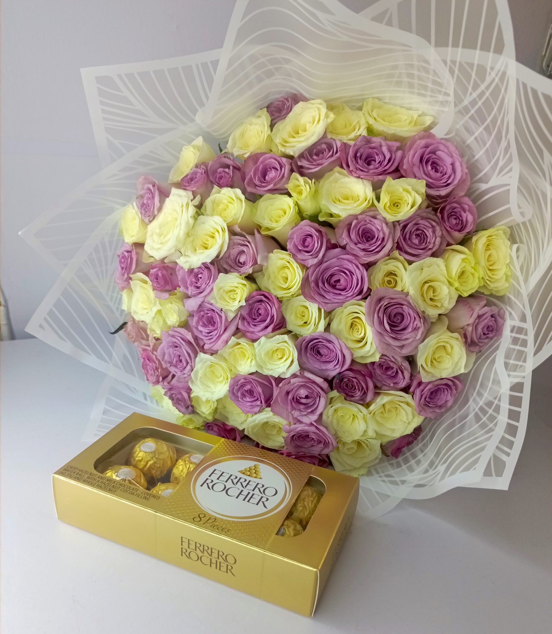 A stunning bouquet of lilac and cream roses, beautifully wrapped to create a soft, elegant look — paired perfectly with a box of Ferrero Rocher chocolates.