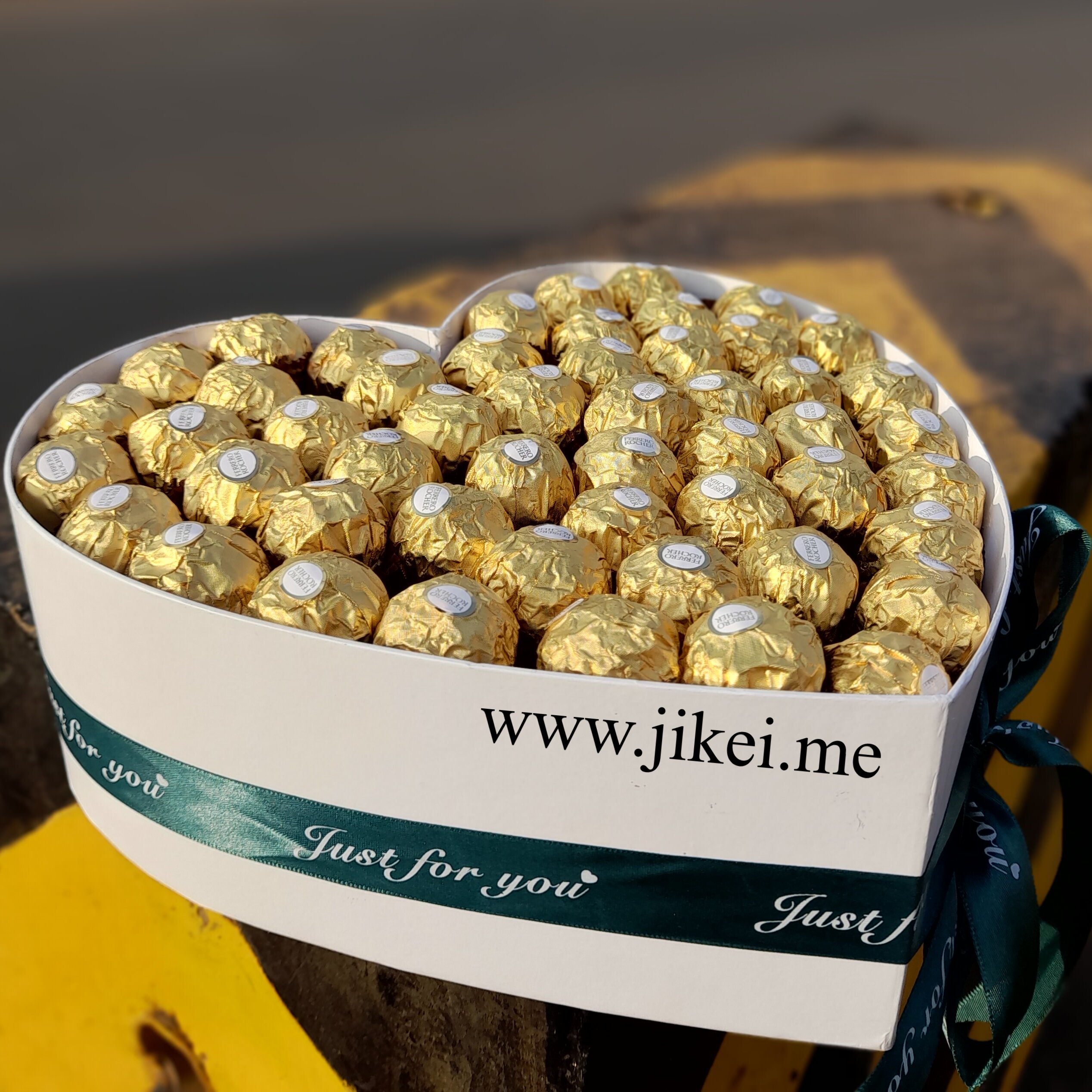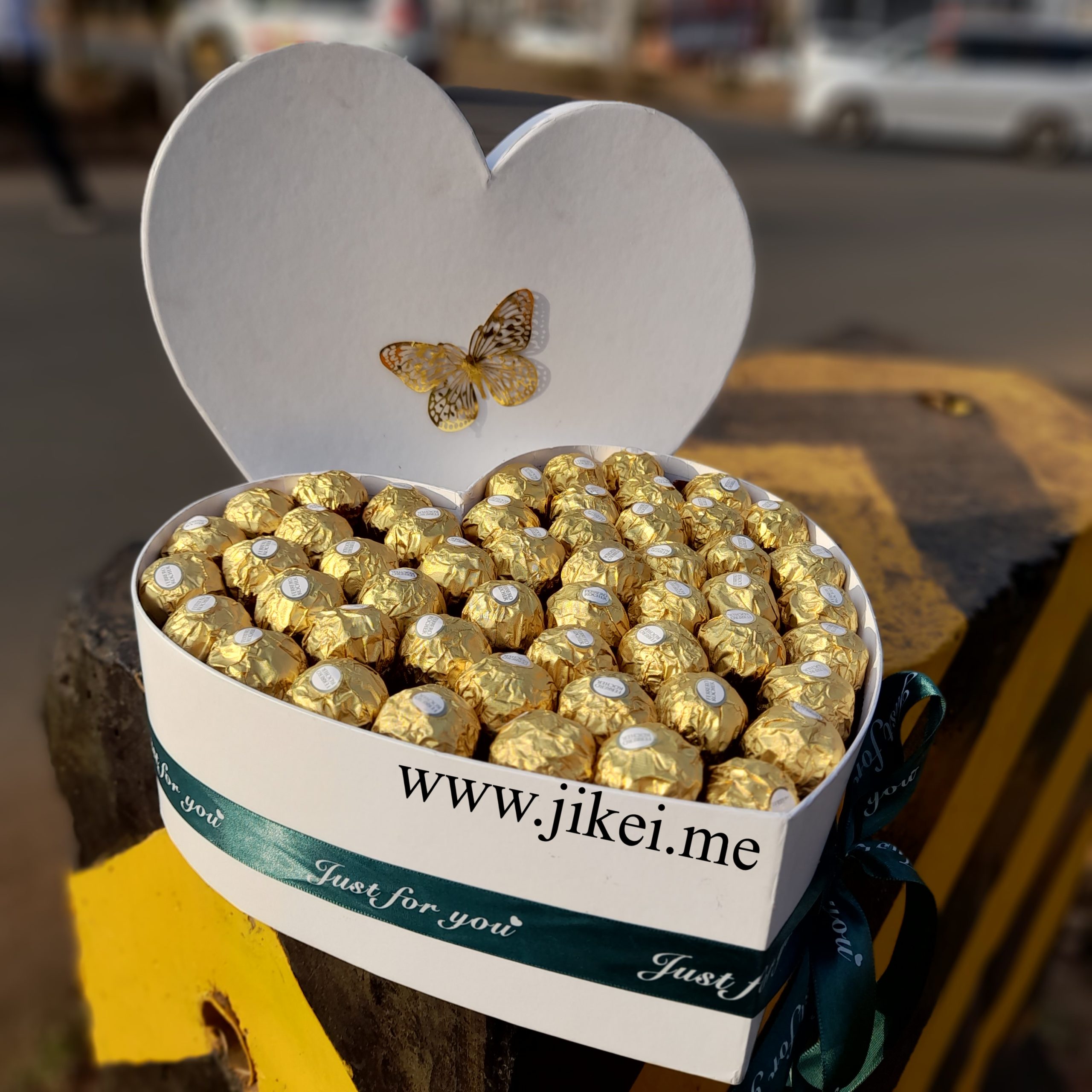 Ferrero Rocher Perfect arrangement in a Heart shaped hatbox. This is a precious gift to mark any occasion, get this arrangement  same day delivery within Nairobi and Get it delivered to others parts of Kenya.