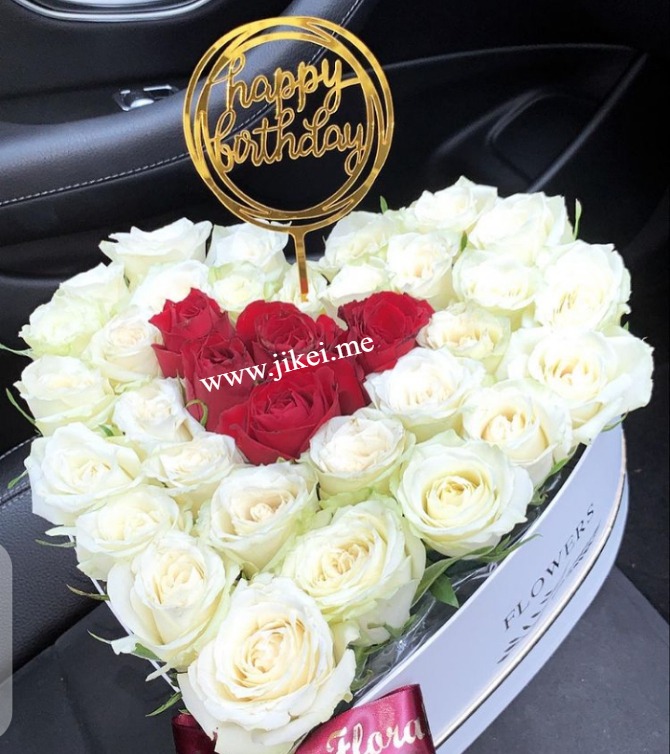 Medium hatbox flowers with 2 range colour of roses making a nice pattern plus a birthday topper and card.