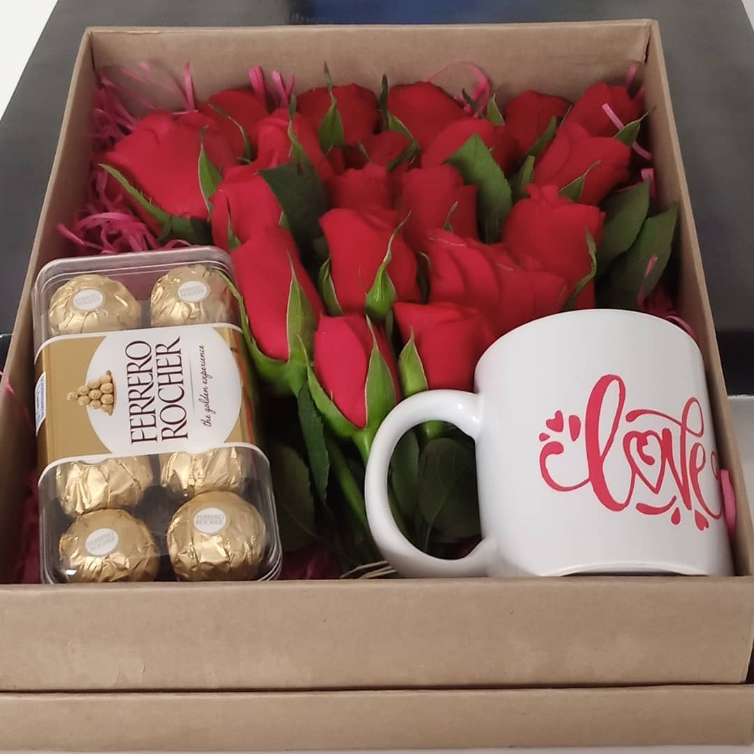 An arrangement of Layered flowers and ferrero T16 chocolates and a customized mug.