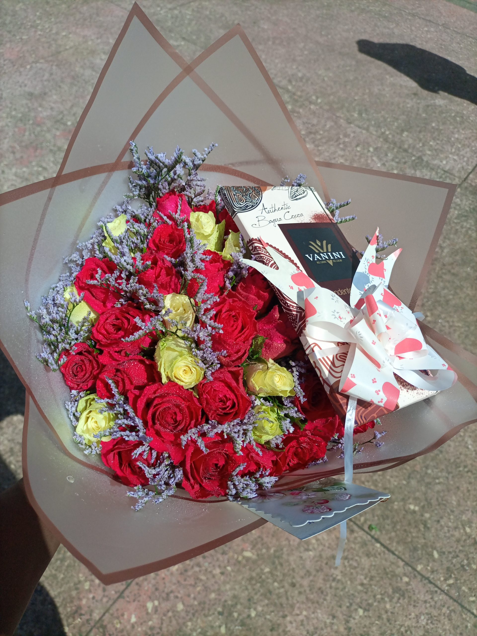 A handheld bouquet with chocolate.