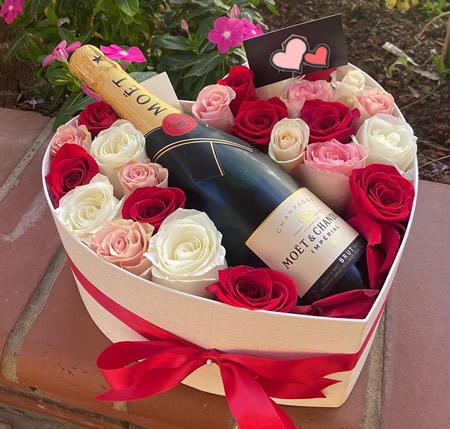 Heart-shaped hatbox with an executive wine, made with roses.