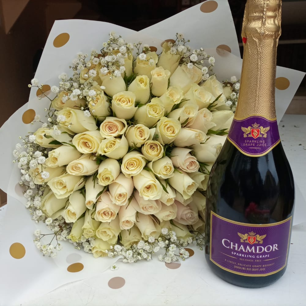 A bouquet of Flowers and a non-alcoholic wine