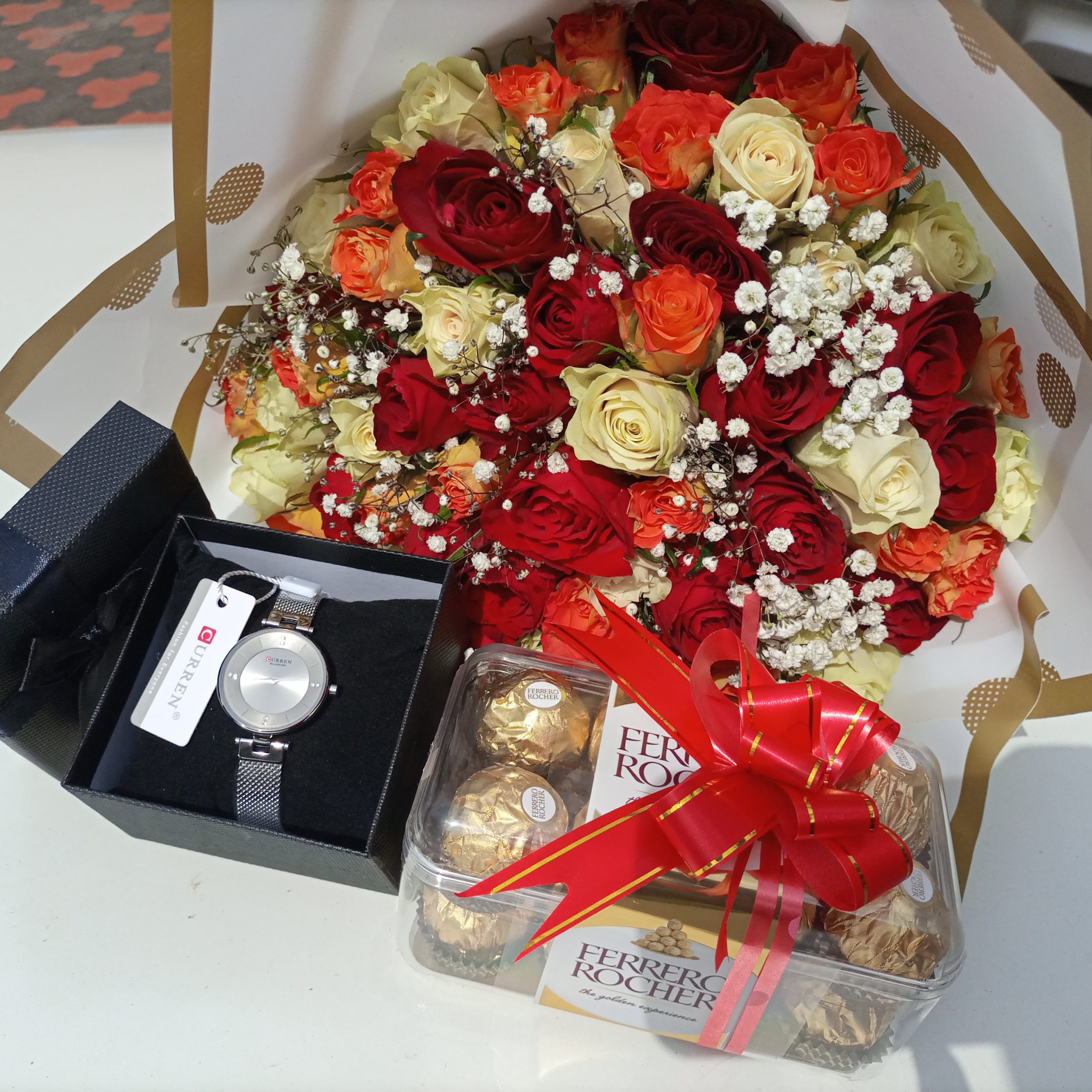 High-end watch, ferrero Rocher 16pcs and a handheld bouquet will make memorable moments.