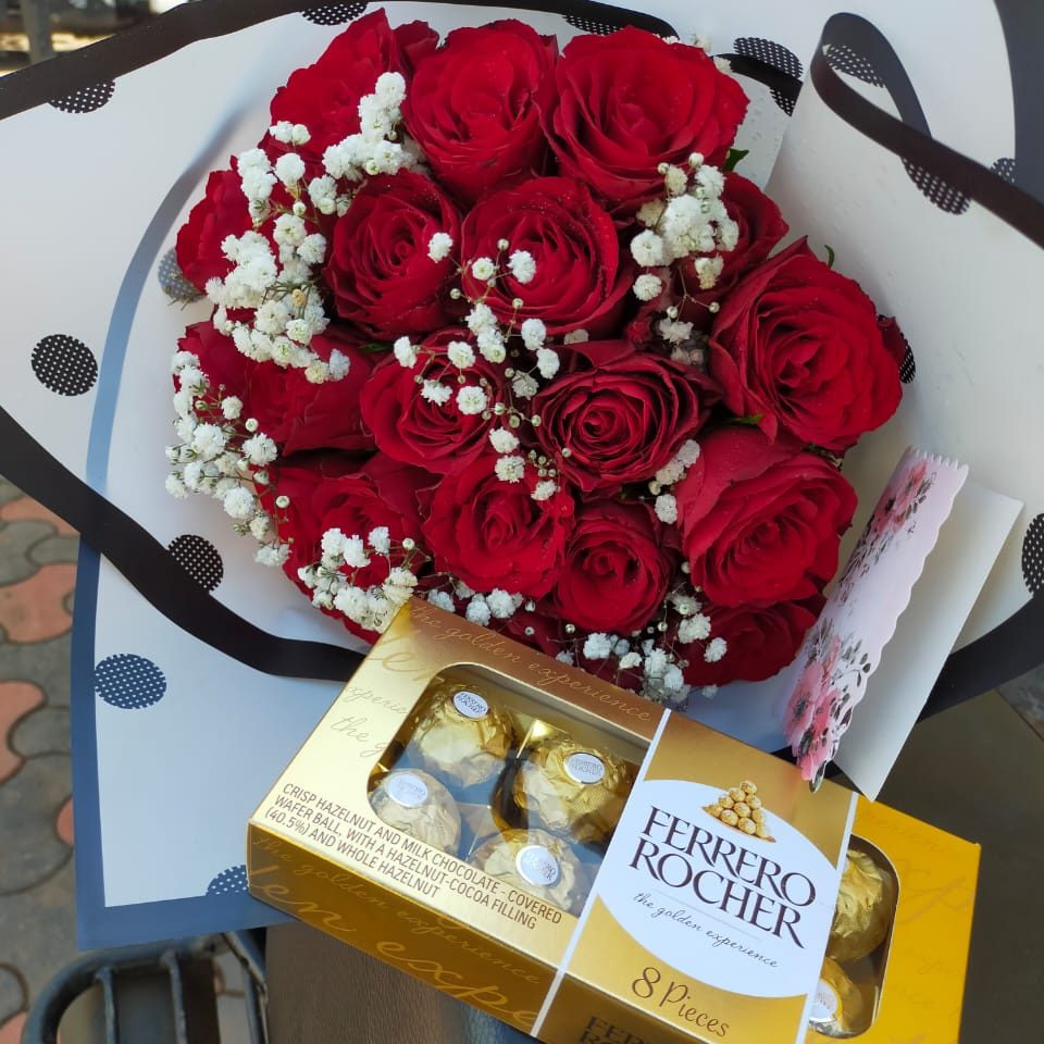 Elevate any occasion with our exquisite package, featuring a delightful combination of Ferrero Rocher T8 chocolates, 20 stems of fresh roses, and a touch of delicate gypsophila. Whether you’re celebrating a special moment or simply looking to make someone’s day, this package is the perfect choice.