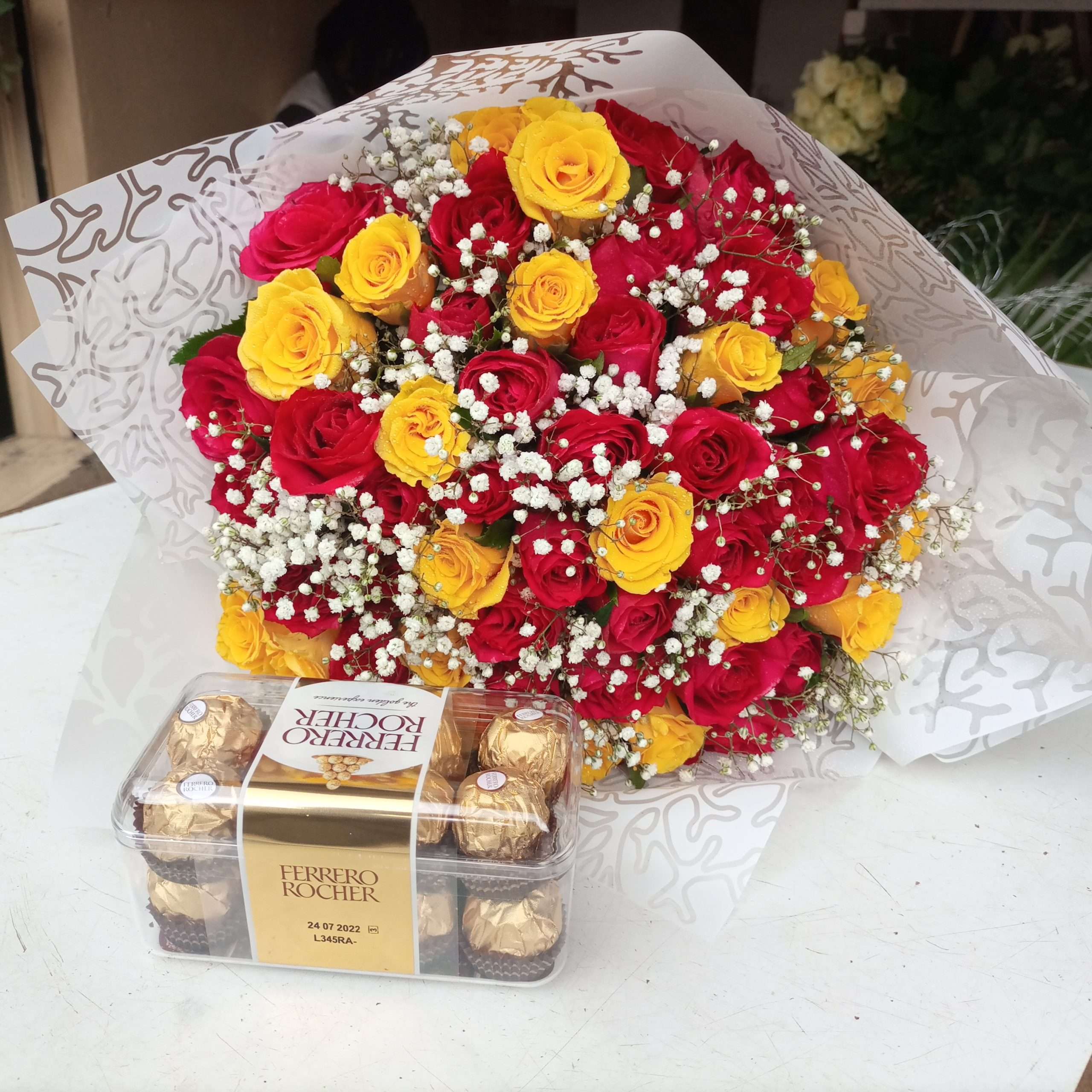 Handtied bouquet complimented by ferrero rocher 16pcs