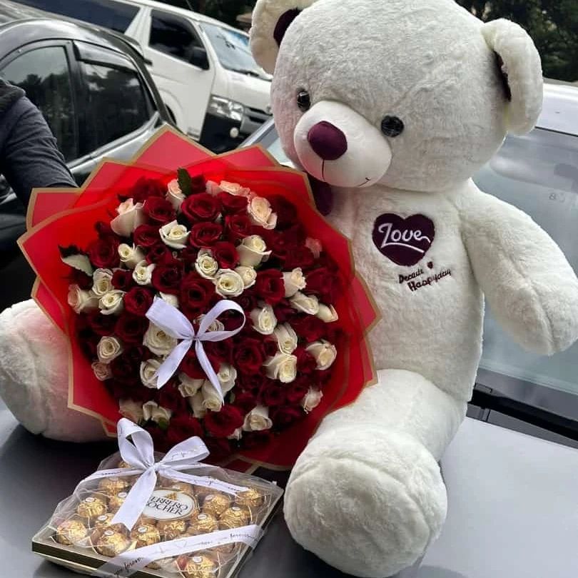 “Dive into a world of love and luxury with our irresistible trio! Snuggle up with our 100cm Teddy Bear, indulge in 24 Ferrero Rocher chocolates, and bask in the beauty of 80 assorted stems. It’s the ultimate trifecta of affection and elegance! Order now and make every moment memorable! #TeddyTreats #ChocoBliss #FloralFusion”
