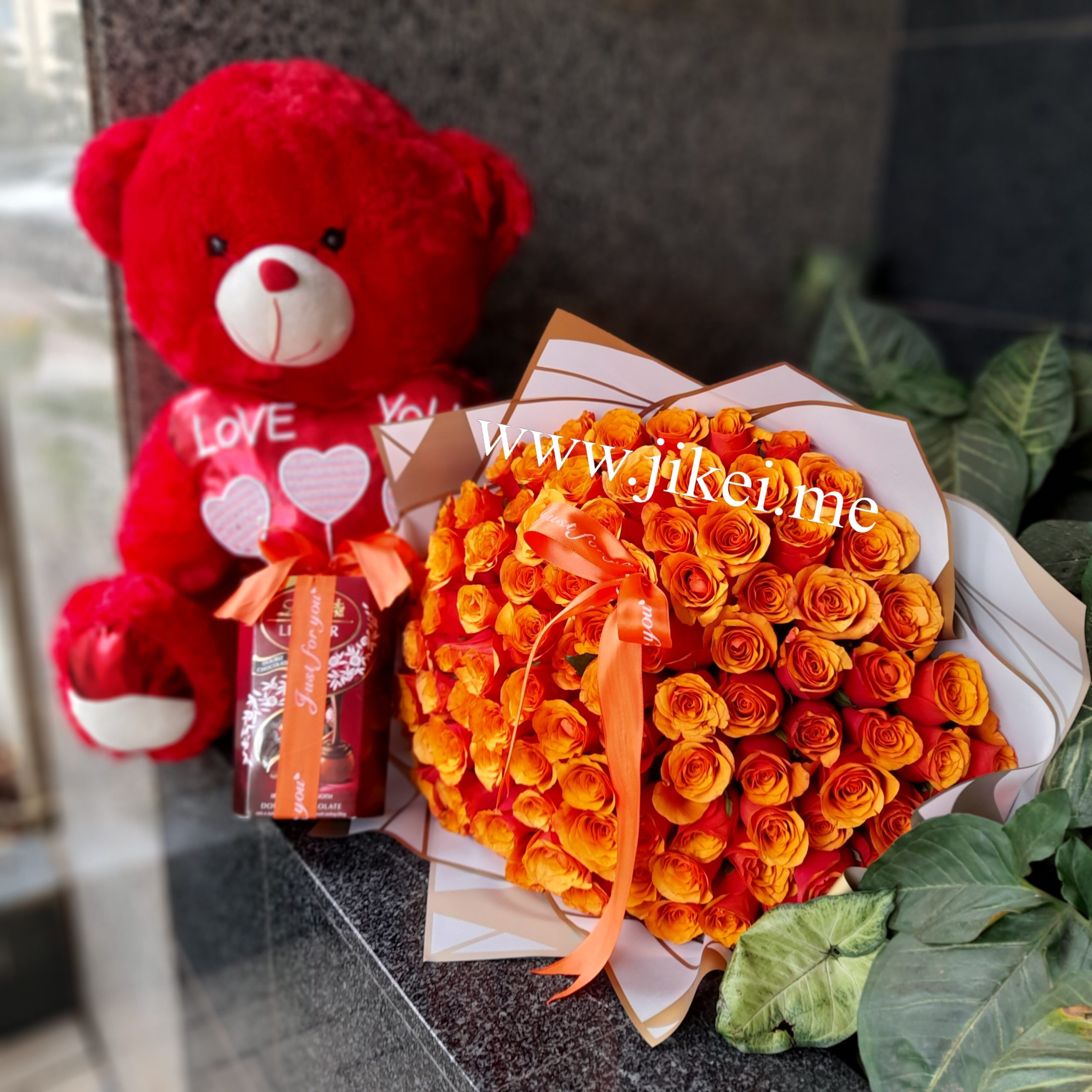 Teddy bear, Lindor chocolates and 100 stems of fresh roses, Colour of the arrangement may vary depending on the availability. This package is available for same day delivery within Nairobi. Fresh Flower delivery within Nairobi.