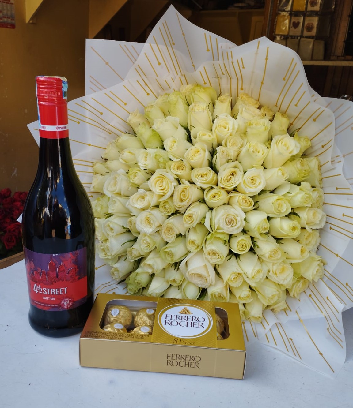 WINE, FERRERO CHOCOLATES & 80 WHITE ROSES