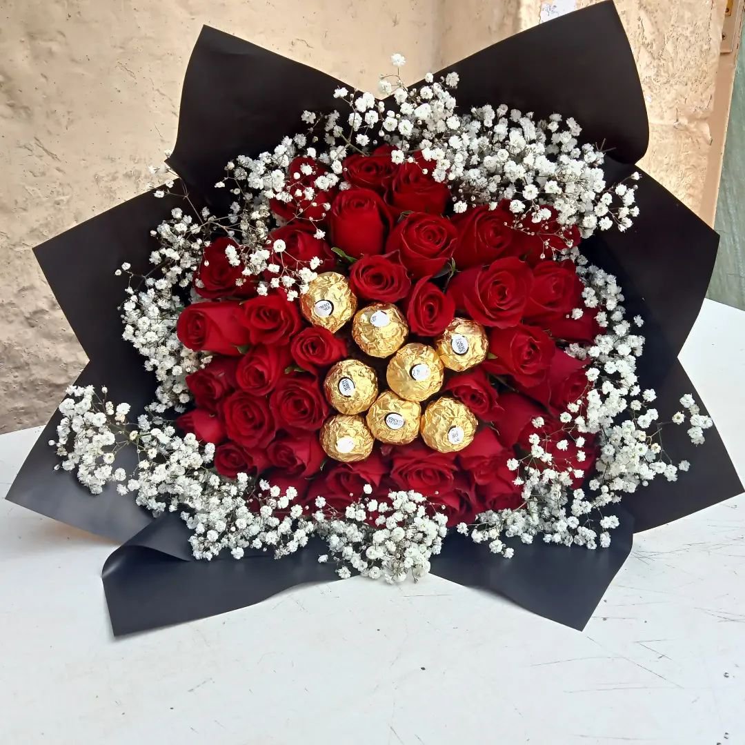 8pcs of Ferrero Rocher with Red roses wrapped around with gypsophila.